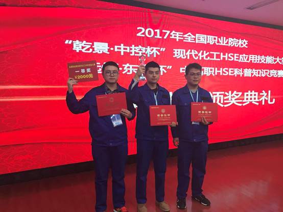 2017年11月29日至12月1日,由中国化工教育协会、全国石油和化工职业教育教学指导委员会、中国职业安全健康协会职业安全健康教育专业委员会主办的“乾景-中控杯”现代化工HSE应用技能大赛、“远恒-东方杯”中高职HSE科普知识竞赛在徐州工业技术学院举行。大赛共吸引16个省市自治区、42个院校、92支代表队伍参赛,经过三天的激烈争夺,应化学院学子代表我校获得“乾景-中控杯”现代化工HSE应用技能大赛一等奖、“远恒-东方杯”2017年全国职业院校中高职HSE科普知识竞赛两个二等奖的好成绩,我院教师王静、鲁凤、康小珍获得优秀指导教师称号。