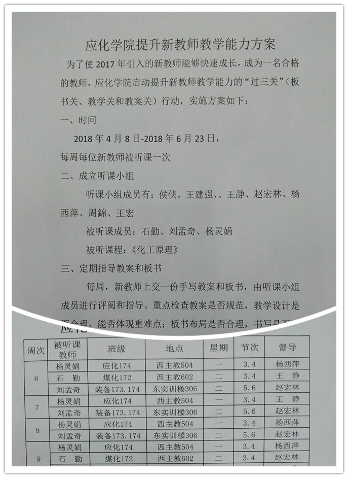 2017年应化学院共引进三名新教师,根据三名新教师的实际教学任务,应化学院详细制定了提升新教师教学能力的方案,并专门成立了由院领导和授课经验丰富的老教师组成的听课小组,保证新教师“过三关”活动能保质保量的顺利开展。本次活动开展时间为4月16日至6月23日,每周每位新教师要求被听课一次,上交一份手写教案和板书,由听课小组成员进行评阅和指导,重点检查教案是否规范,教学设计是否合理,能否体现教学重难点;板书布局是否合理,书写是否清晰。最后,由听课小组对新教师进行综合评价和考核。