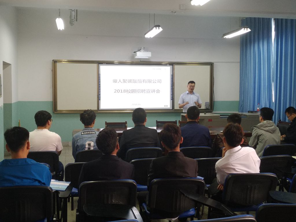 帝人集团创立于1918年,是日本第一家生产人造纤维的公司,处于全球合成纤维生产及技术的领先地位。帝人聚碳酸酯有限公司是由帝人集团于2003年出资设立,是生产聚碳酸酯的日本独资企业,生产范围覆盖高性能纤维、化学品、医药、家庭医疗、IT等各方面。早在1998年筹建新加坡聚碳酸酯有限公司时帝人集团就在我校招聘了一批优秀毕业生并逐步成长为公司核心骨干。