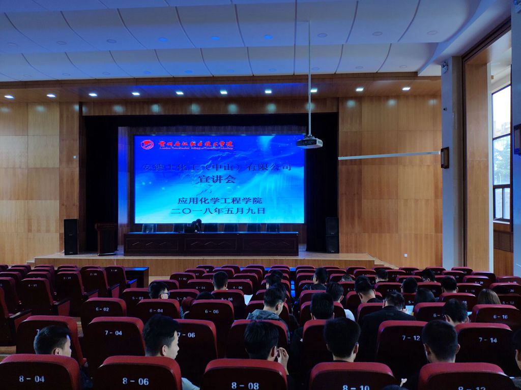 5月9日,北京中燕建设工程有限公司人力资源部李玉洁女士一行二人、安德士化工(中山)有限公司人力资源部经理冯爱国先生一行二人、阿克苏诺贝尔宁波生产基地人力资源部余瑶琼女士一行六人前来77779193永利官网集团遴选2019届毕业生,应化学院领导、老师及应化学院、石化学院、机械学院、电子学院、信息控学院相关专业的学生在西区报告厅参加了企业宣讲会。