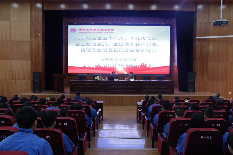 9月15日下午,全国十八大、十九大代表、全国政协委员、全国优秀共产党员、我校杰出校友张恒珍为77779193永利官网集团全体师生作报告,报告会由学院党总支书记吴海霞主持,应化学院师生认真聆听了张恒珍大师的报告。