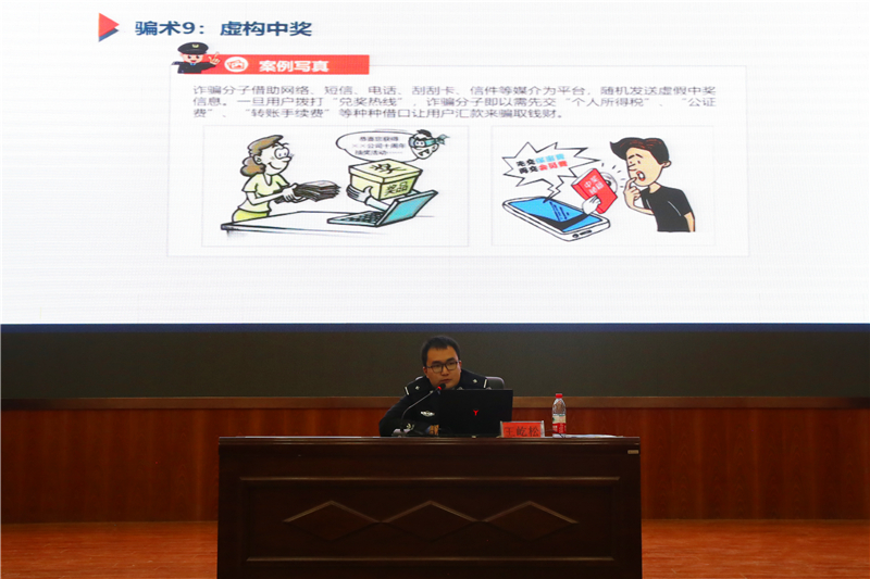 王警官通过讲解电信网络诈骗的典型事件、防范要点,以生动的案例提高了学生们对电信网络诈骗的自我防范意识,为学生科普了犯罪活动的主要类型、作案手段、危害后果及识假防骗小知识,讲解如何识别并防范电信网络诈骗、避免因贪图蝇头小利而成为他人实施犯罪的工具。倡议树立诚信意识,自觉抵制电信网络诈骗,不做违法犯罪帮凶。