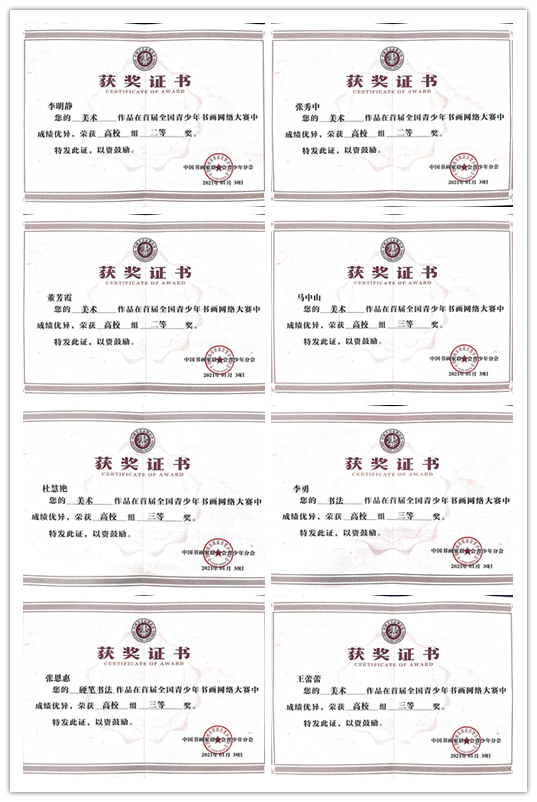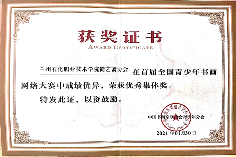 近日,由中国书画家联谊会指导、中国书画家联谊会青少年分会主办的首届全国青少年书画网络大赛公布获奖名单。我院简艺斋协会的15幅作品在全国高校组竞赛中获奖,其中二等奖5名、三等奖7名、优秀奖3名,优秀辅导教师奖2项,兰州石化职业技术学院荣获优秀集体奖。