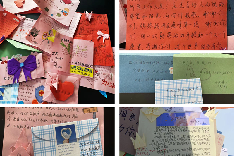 11月4日上午,来自甘肃宝石花医院(兰州石化总医院)的核酸检测医护人员在石化大学西校区完成了第四轮核酸检测,学生们虽然看不清医护人员防护服背后的面孔,但这却让象牙塔中的00后最真切地感受到疫情下的温度。同学们把自己精心制作,亲笔写下的感谢信送给医护人员“我不能帮您们分担什么,甚至怕这封信您们无法看见,只希望您们不要太累,多穿些衣服,注意保暖,才能有力气一同战胜疫魔。”“核酸检测的白衣天使,谢谢您!”等内容。一封信,表达了应化学子的感恩之情,学习医护人员抗击疫情,共克时艰的拼搏精神,无私奉献的家国情怀!一封信,虽然简短,却代表了应化学子最真心的感谢;一封信,尽管平实,却表达了应化学子师生最真挚的祝福。医护人员向同学们说:“看到信中的内容,这些话,给了我们很大的安慰。我们最大的愿望就是希望同学们都能保护好自己,健健康康。”