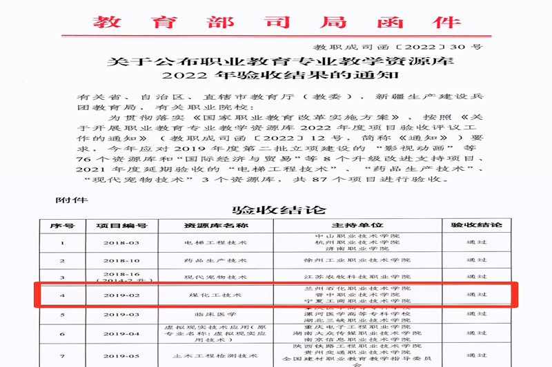 12月26日,教育部公布了职业教育专业教学资源库2022年验收结果名单。由我校作为第一主持单位建设完成的“教育部职业教育煤化工技术专业教学资源库”顺利通过验收,这是我校取得的又一项重大标志性成果。也是甘肃省高职院校唯一作为第一主持单位建设的资源库,是国家“双高计划”建设重点项目和重要评审指标。
