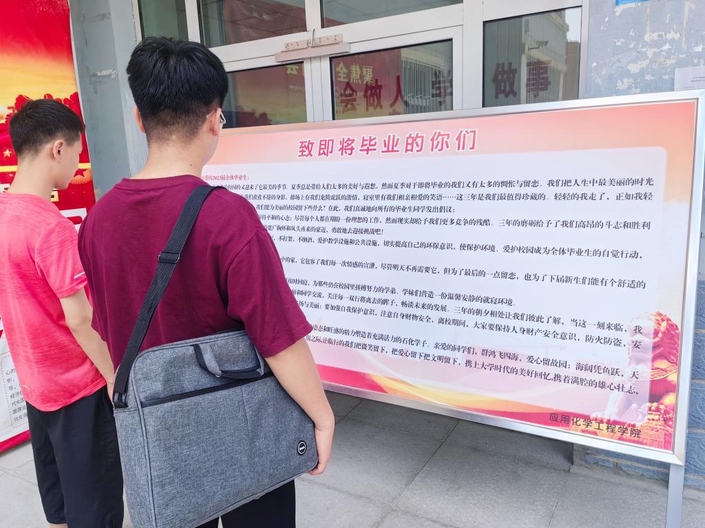 一是向全体毕业生发出《致2023届毕业生文明离校倡议书》,并将倡议书宣传展板摆放于公寓楼前展出。同时,通过毕业生班级QQ群、毕业生微信群等平台宣传文明离校倡议书。旨在强化全体毕业生的文明离校意识,号召大家安全、有序、文明、愉快离校,营造良好的离校氛围,维护校园和谐稳定。