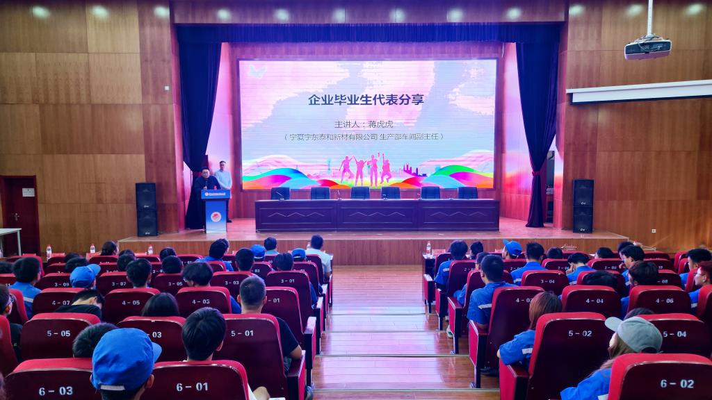 在主题分享阶段,首先播放了宁东能源化工基地人才招引政策;接着泰和新材集团股份有限公司人力资源部李晓娟详细介绍了公司基本情况及订单班培养方案;紧接着公司优秀员工、我校优秀毕业生代表蒋虎虎和徐捷结合自身发展历程为学弟学妹们分享了行业未来的发展前景和在校期间必须练就的专业技能。分享结束后,参会学生就存疑的问题和领导嘉宾进行了热烈的交流。
