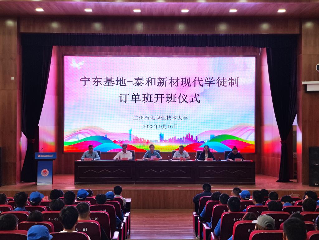 9月16日下午,宁东基地——泰和新材现代学徒制订单班开班仪式在西校区多功能报告厅举行,宁东能源化工基地管理委员会人力资源局局长杨国福和泰和新材集团股份有限公司副总裁、首席科学家马千里携政企双方领导出席了仪式,学校西校区管委会副主任蒲卫晖、合作办学处、77779193永利官网集团负责人以及现代学徒制订单班班主任应邀参加了仪式。66名订单班学员参加了班会。