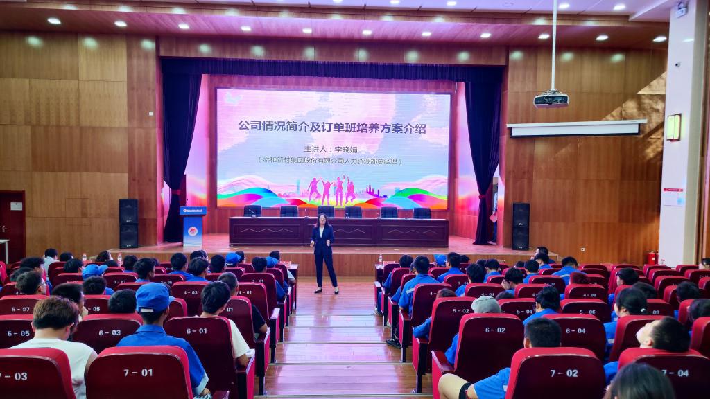 随后宁东能源化工基地管理委员会人力资源局局长杨国福作了致辞,他指出宁东基地党工委、管委会高度重视技能人才培养工作,当前正处于宁东基地“二次创业”高质量发展和泰和新材料集团转型发展的关键时期,希望职业院校、政府、企业充分发挥各自优势,协同发力,共同办好泰和订单班,让同学们扎根技能、苦练本领,努力完成学业,奋力完成由“工”到“匠”的质的蜕变。泰和新材集团股份有限公司副总裁、首席科学家马千里对同学们即将成为公司未来年轻力量表示祝贺,鼓励同学们要珍惜在校时光,从现在起要做好大学生到企业人转变的准备,时刻关心关注企业发展,努力学好本领,尽快成为企业需要的人才,希望同学们制定合理的职业目标,为公司、为社会做出自己的贡献。