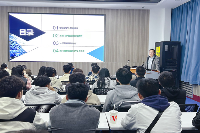 随后,化工创新创业中心主任王刚详细向师生介绍了实验室中可能存在的安全隐患、实验室安全的重要性、危险化学品的使用和防护,着重讲解了实验中要遵守操作规程、严禁脱岗、戴好防护工具,要求大家只有将安全意识牢记于心方可进入实验室。最后,对同学们提出了期望和要求:一是要求永远保持忧患意识,警钟长鸣;二是牢固树立起安全意识,切实掌握基本的操作技能,方可开展科创实验。