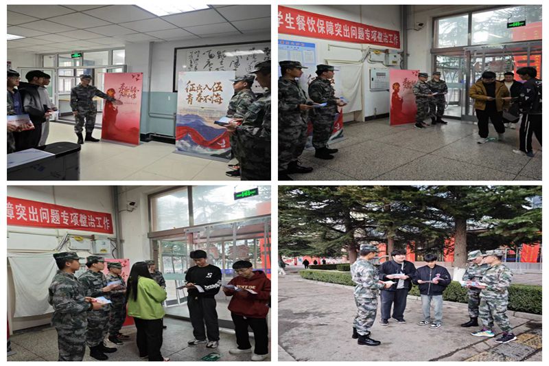 一是征兵宣传进班级。为烘托征兵宣传氛围,征兵宣讲员们深入班级开展征兵宣讲,并在教学楼前设置征兵宣传海报,向前来咨询的同学详细介绍应征入伍条件、报名方式、入伍流程以及大学生参军入伍优待政策等相关内容,进一步激发同学们携笔从戎,用满腔热血助力强军兴军伟业。