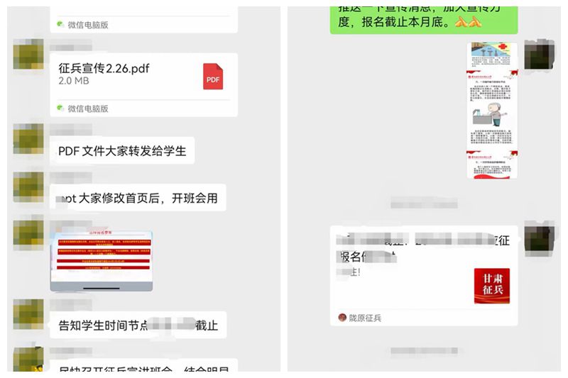 二是征兵宣传进网络。学院通过网络平台加大征兵宣传力度,利用2024届班主任微信群、QQ群、班主任朋友圈推送功能,聚焦学生关注的问题开展“2024年征兵政策咨询”活动,增加了宣传推送频次,扩大征兵宣传覆盖面、影响力;学院还结合征兵宣讲活动实际,协助班主任对有需要的同学进行征兵政策解答,进一步方便了校内外学生及时掌握2024年的征兵入伍政策,对促进2024届毕业生入伍报名起到了至关重要的作用。