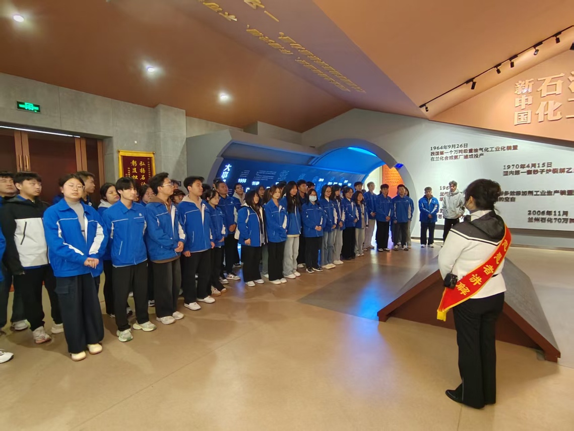 在石油精神教育基地,同学们跟随讲解员依次参观了序厅、主展区、尾厅等十二个展区,系统学习了兰州石化六十多年来艰苦创业、产业报国、为国争光的辉煌历程与厚重文化,深切体悟了“三老四严”石油精神的时代内涵,深刻领会了“自强不息、艰苦奋斗,苦干实干、兴业报国,敢为人先、追求卓越”的企业精神。