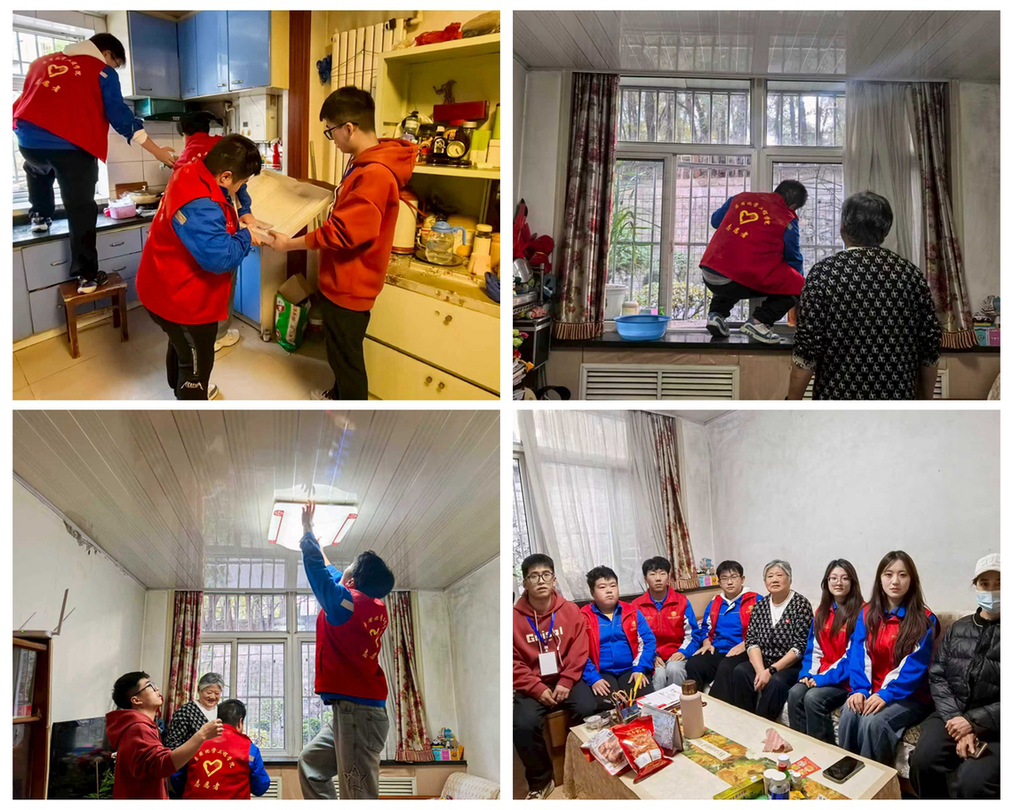 活动现场,志愿者们以小组为单位,分批走进社区老人家中,把关怀送到“心坎上”。在老人家中,志愿者们轻轻握着老人的手促膝长谈,耐心倾听老人追忆过往岁月里的生活点滴,细致询问饮食起居、健康状况与实际需求。一句句关切问候、一次次专注倾听,不仅驱散了老人的独居孤寂,更送去了心灵慰藉与青春暖意。面对行动不便的老人,志愿者们主动化身“生活小帮手”:有人搬来梯子,小心翼翼擦拭天花板积尘的灯具;有人蹲在厨房角落,细致清理顽固油污;有人手持抹布,逐扇擦净窗户上的污渍。汗水浸湿衣袖,却换来了老人家中窗明几净的整洁环境,也让老人脸上绽放出欣慰笑容。