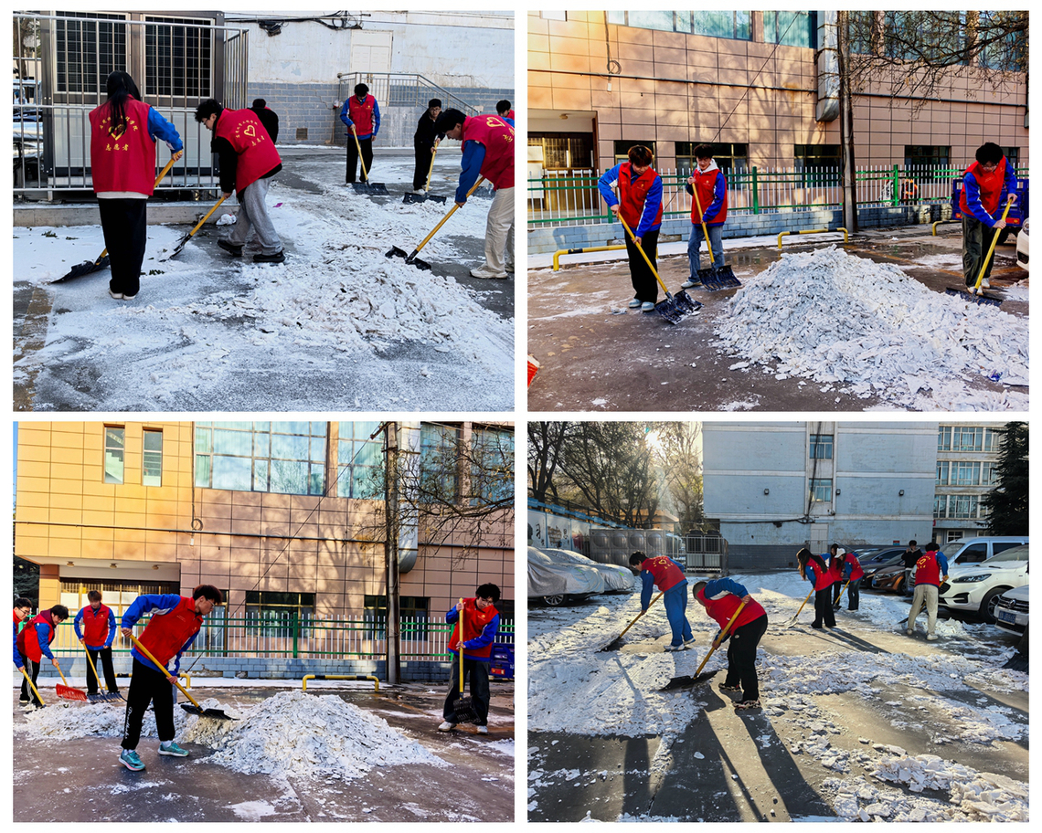 活动当天,尽管寒意袭人,但志愿者们热情高涨,准时在指定地点集结。在明确分工后,大家手持铁锹、扫帚、推雪板等工具,迅速投入到清雪除冰的工作中。教学楼前、宿舍区路口、食堂周边及图书馆广场等人流密集区域处处可见志愿者们忙碌的身影。他们不畏严寒,齐心协力,有的奋力铲除压实坚冰,有的仔细清扫残余积雪,默契的配合与持续的努力,让一条条被积雪覆盖的道路逐渐恢复了原本面貌,为冬日校园开辟出安全畅通的行走通道。